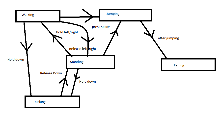 To deal with this, you could have a flag as an If statement that is unset when the player lands. But then we want to add more actions such as ducking and walking, and each time something gets added, we end up with total spaghetti code and confusing bugs.
